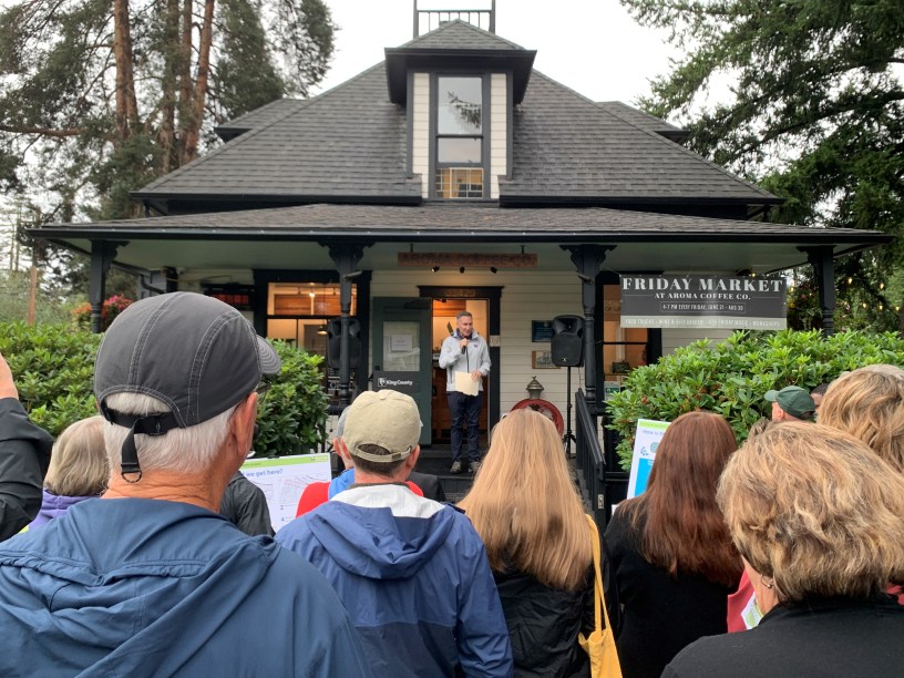 On Friday, Aug. 23, King County Executive Dow Constantine, Councilmember Sarah Perry, county and community leaders gathered on the steps of Aroma Coffee to celebrate the construction kickoff for the Fall City on-site septic system project.