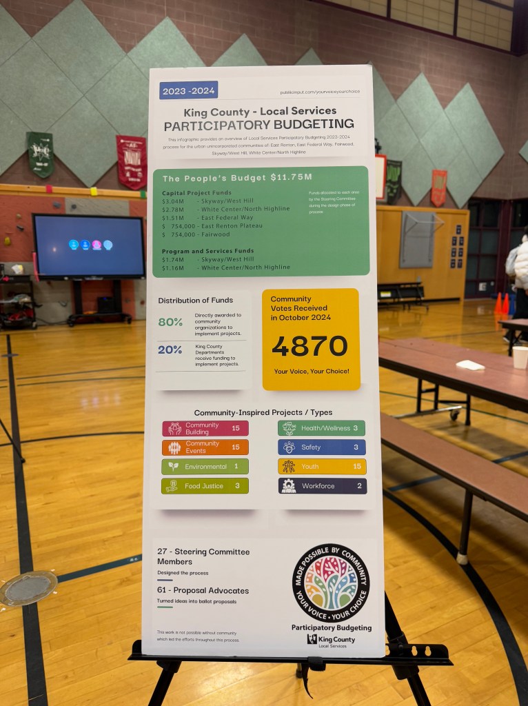 More than 200 people packed the White Center Heights Elementary cafeteria and gymnasium to celebrate the program’s achievement of delivering its second Participatory Budgeting process in three years. This week’s celebration was the culmination of planning, meetings, boots-on-the-ground advocacy for more than year and a half.