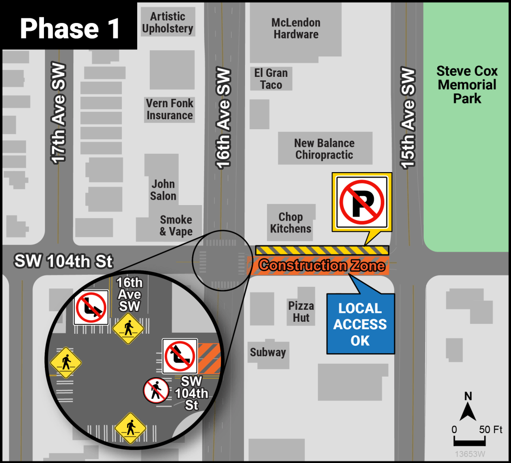 - Where: The north half of the intersection where 16th Avenue SW meets SW 104th Street will be closed to all through traffic, including pedestrians and bikes.