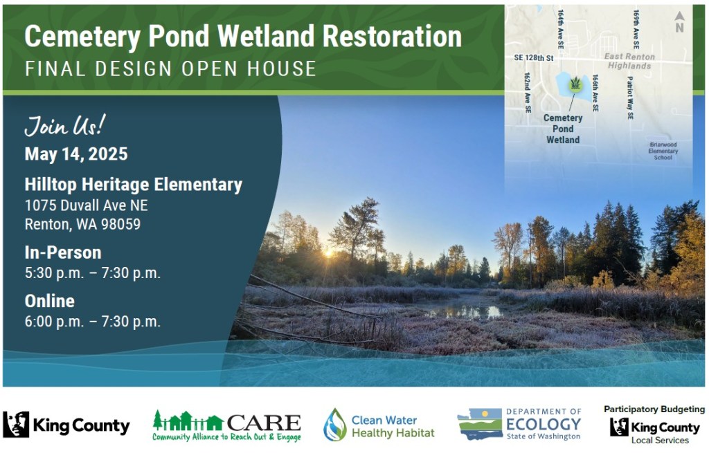On May 14, DNRP will hold a design presentation and online/in-person open house event in Renton, where it will present the final design. The event will include a presentation on the latest design plans and a community Q&A for the Cemetery Pond wetland restoration and stormwater park project on the roughly 13-acre parcel. This is an opportunity for community members to meet the project team, see the latest designs, and share feedback to help shape this important restoration effort.